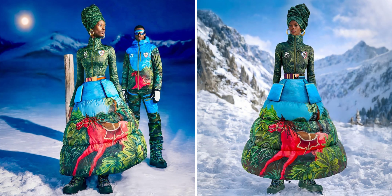 Designerin Stella Jean liefert hier pure Magie. Jeder Zentimeter Stoff trägt den Anspruch, eine Geschichte zu erzählen, so die Designerin auf Instagram. Der Hingucker: Ein leuchtend rotes Pferd, das durch grüne Wälder vor hellblauem Himmel galoppiert. Entworfen wurden die Motive vom ehemaligen Ski-Star Pietro Vitalini. Besonders einzigartig: Als einziges Team überhaupt treten die Haitianer in handbemalten Outfits an!