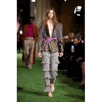 Obwohl Valentino seine Kollektionen normalerweise in Paris zeigt, ist Rom das pochende Herz der Marke, die hier 1960 gegründet wurde. Die Show am Donnerstag an einer der spektakulärsten Locations der Stadt war jedoch mehr als nur ein Fashion-Statement: Es war die erste Prêt-à-porter-Kollektion seit dem Tod des legendären Gründers Valentino Garavani, der am 19. Jänner im Alter von 93 Jahren verstarb. Der Mann, der Ikonen wie Jackie Kennedy, Elizabeth Taylor, Prinzessin Diana und Julia Roberts einkleidete, hat ein Erbe hinterlassen, das nun in seiner Heimatstadt gebührend gefeiert wurde.