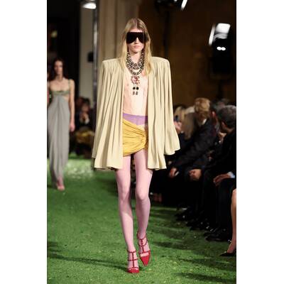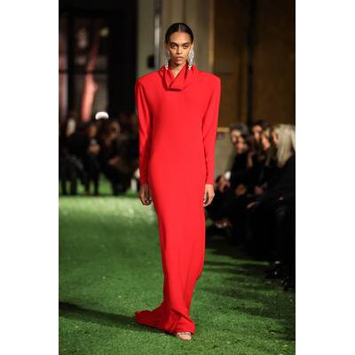Auf dem Runway schickte Alessandro Michele seine Models auf eine glamouröse Zeitreise in die 80er Jahre. Starke Schulterpolster, extrem schmale Taillen und freche Miniröcke dominierten die Show. Kombiniert wurde das Ganze mit massivem Statement-Schmuck – Perlen und klobige Anhänger sind jetzt ein absolutes Must-have! Das Beste hob sich Michele für den Schluss auf: Das letzte Kleid der Show, eine langärmelige Robe mit einem dramatisch tiefen Rückenausschnitt, erstrahlte in jenem ikonischen Rot, das untrennbar mit dem Namen Valentino verbunden ist.