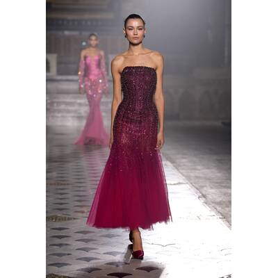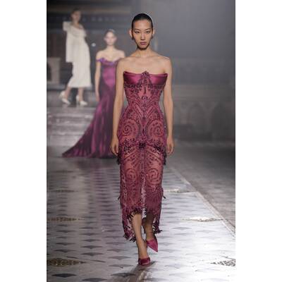Besonders auffällig war die edle Farbwelt: Tiefes Burgunderrot, Rosé-Töne und schimmernde Stickereien verliehen den Kleidern eine luxuriöse Aura. Einige der figurbetonten Bustier-Kleider waren mit so aufwendigen Perlen- und Kristallmustern verziert, dass sie wie bewegliche Schmuckstücke wirkten.