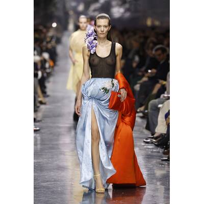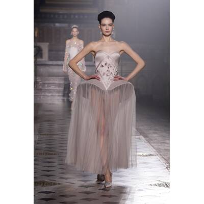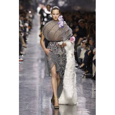 Die Kollektion war ein einziger Schiaparelli-Rausch: Überdimensionale Federn, transparente Stoffe, viel Spitze und Silhouetten, die bewusst zwischen Fetisch, Couture und Surrealismus pendelten. Roseberry spielte erneut mit Körper und Illusion: Haut wurde enthüllt, verhüllt, verzerrt.