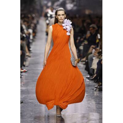 Ein starkes visuelles Leitmotiv war die Farbe Orange – kraftvoll, sonnig und absolut untypisch für klassische Couture. In Kombination mit floralen Details und fein ausgearbeiteten Oberflächen entstand ein spannender Kontrast zwischen Härte und Zartheit.