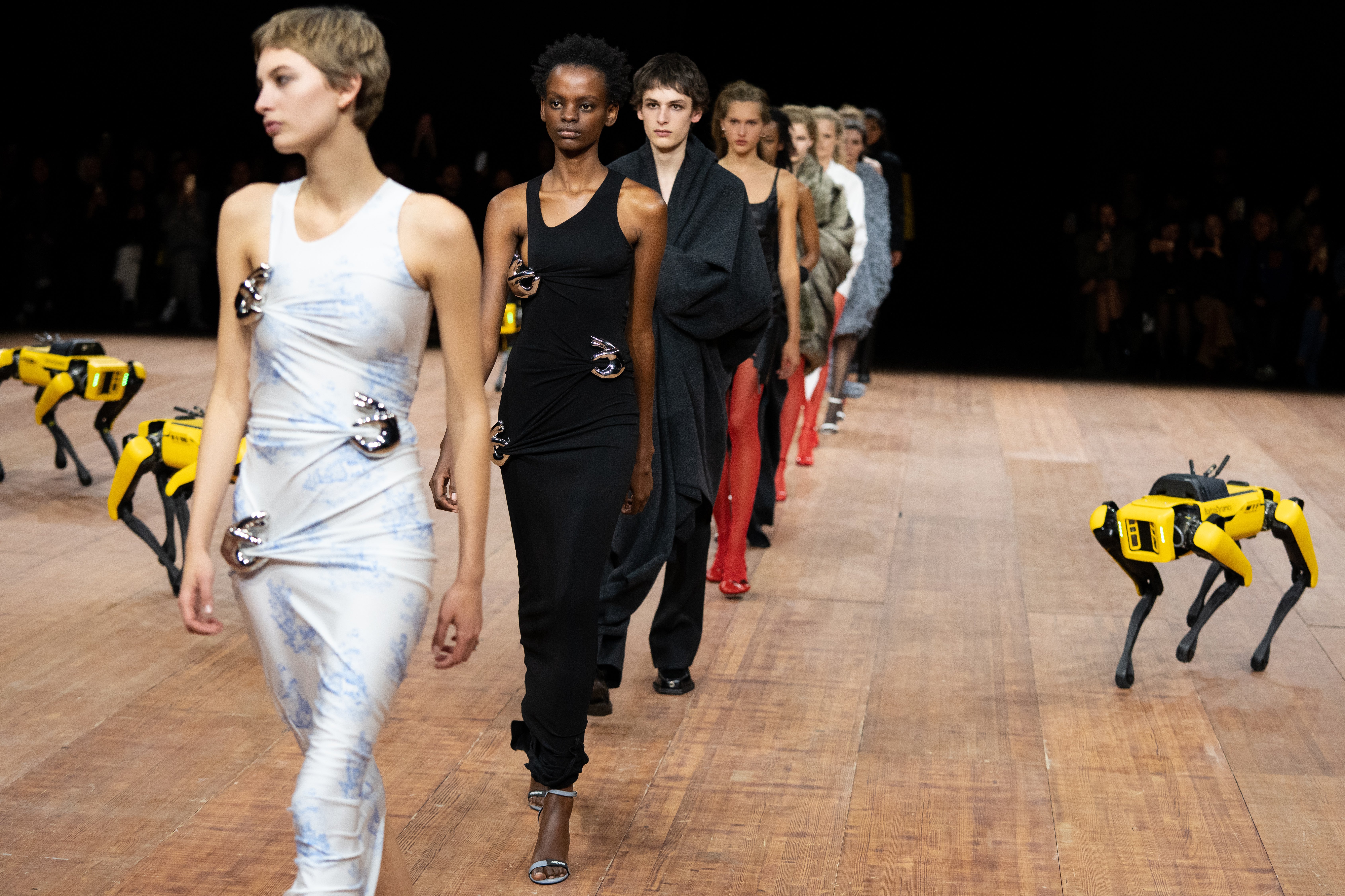 Nach der spektakulären Show, bei dem das Label Coperni dem Model Bella Hadid ein Kleid aufgesprüht hat (HIER geht's zum ganzen Artikel), setzt das Modehaus erneut auf Hi-Tech. Diesmal teilten sich die Models mit Roboterhunden den Laufsteg.