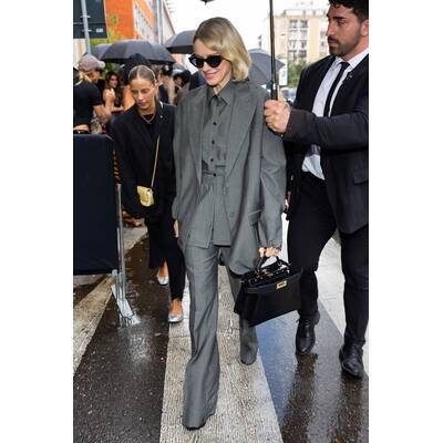 Duff bewies sofort, dass sie modisch nichts verlernt hat und erschien im Colorblocking-Look: ein kurzärmliges rotes Top kombiniert mit einem mintgrünen Satinrock – schlicht, elegant und doch mit Wow-Effekt. Dazu sanfte Wellen im Haar, ein dezentes Glow-Makeup und fast keine Accessoires. Ein Look, der perfekt mit Fendis neuer Kollektion harmonierte.