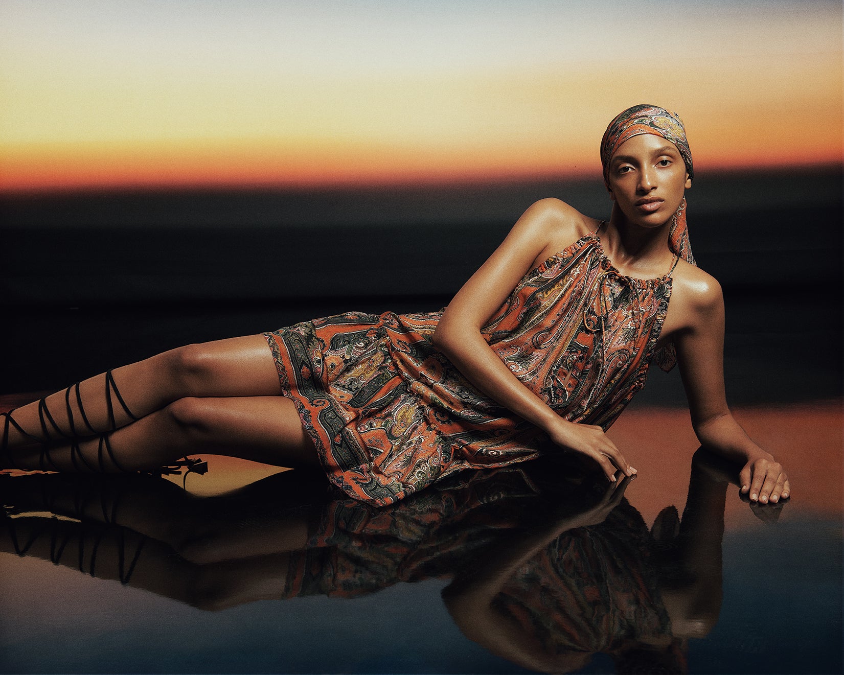 Mit fließenden Silhouetten, seidigen Prints, Fransen aus Wildleder und zarten Stickereien versprühen die Pieces pure Sommerlaune. Eine von Sonnenuntergängen inspirierte Farbwelt – Terrakotta, Rost, Braun und Cremeweiß – verleiht entspannten Hemden und Paisley-Prints eine warme Note. Handgeflochtene Details und kunstvoll gearbeitete Accessoires setzen ein stilvolles Statement mit handwerklichem Touch.