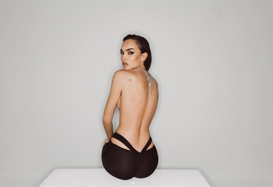 Auch von hinten lies sich das Model für die Kampagne abblitzen. Mit einem verführerischen Blick tragt sie auch auf ihrem zweiten Post lediglich eine Hose mit tiefen Einblicken und zeigt ihre Kurven.