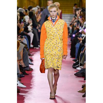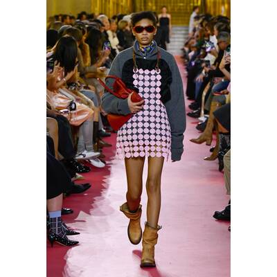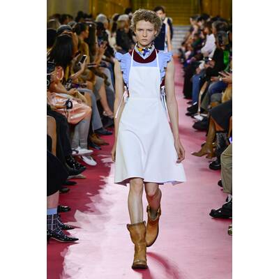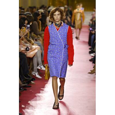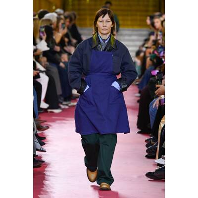 Die Schürzen, die normalerweise mit traditionellen Rollen verbunden sind, wurden von Miu Miu neu interpretiert und mit Statement-Pieces kombiniert, die eine neue, selbstbewusste Weiblichkeit verkörperten.