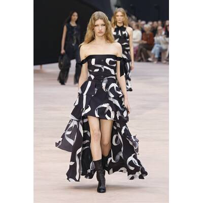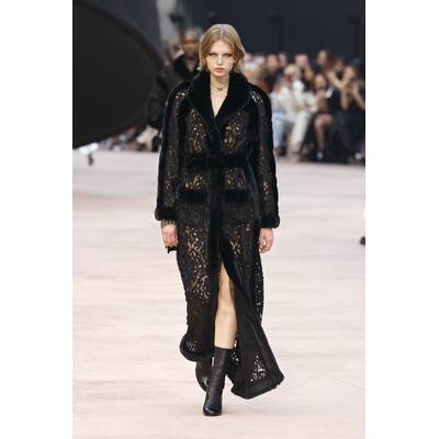 Vittoria präsentierte sich in einem klassischen, schwarzen Bouclé-Minikleid mit einem transparenten, bodenlangen Rock. Dazu kombinierte sie kniehohe Boots, die für einen modernen Kontrast sorgten. Selbstbewusst und elegant schritt sie über den Laufsteg und bewies einmal mehr, warum sie aktuell zu den gefragtesten Models der Branche zählt.