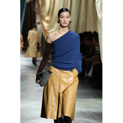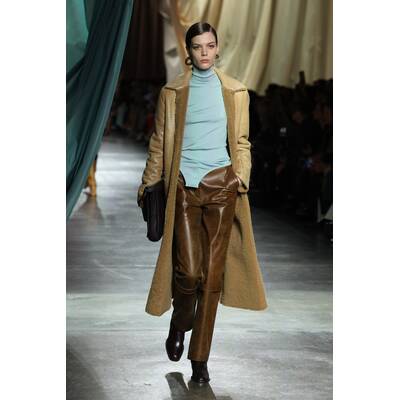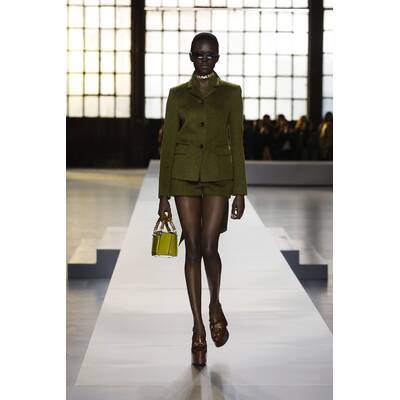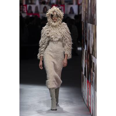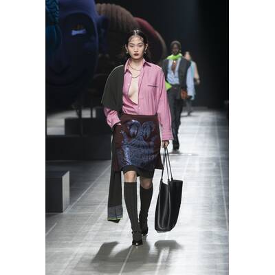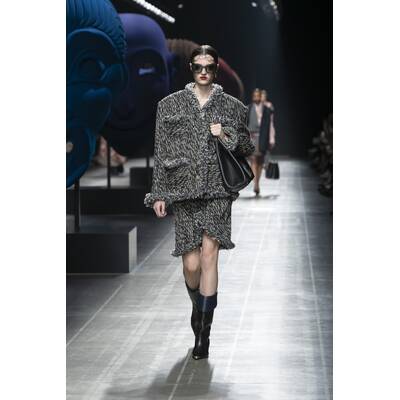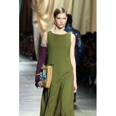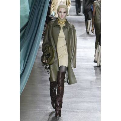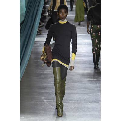Fendi setzt auf der Mailänder Fashion Week auf eine kontrastreiche Farbpalette. Besonders auffallend sind die kleinen Details, wie bunte Strümpfe oder die hohen Stiefel. Neben Blau scheint vor allem Grün in diesem Jahr die bevorzugte Wahl des Modehauses zu sein. Wie bereits in vorherigen Saisons gesehen, sind asymmetrische und überlange Elemente dieses Jahr ebenfalls zu entdecken. Mit XXL-Stoffbahnen ist auch die Dekoration der Fendi-Show in Mailand ein Hingucker.
