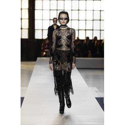 Den Laufsteg dominierte die Farbe Schwarz. Die Kollektion fiel vor allem mit zarten, fließenden Silhouetten, metallischen Anzügen und aufwendigen Perlenarbeiten auf.