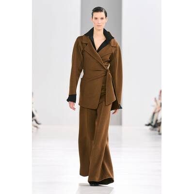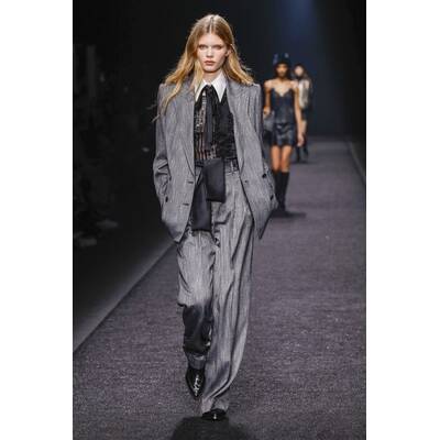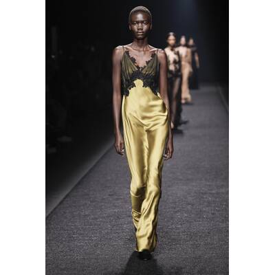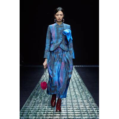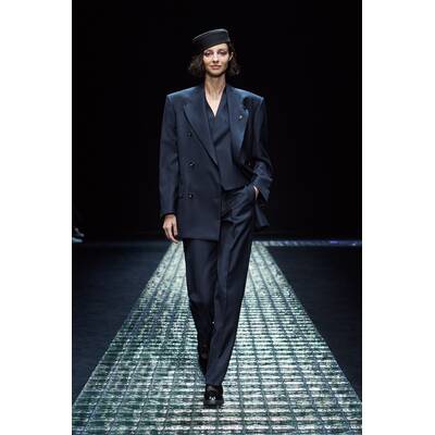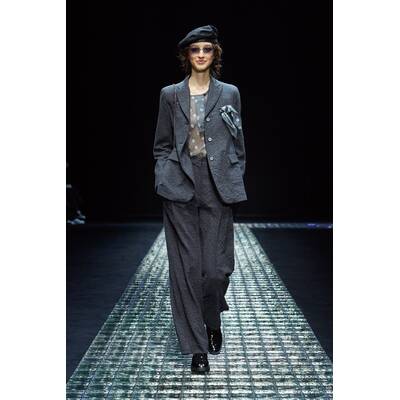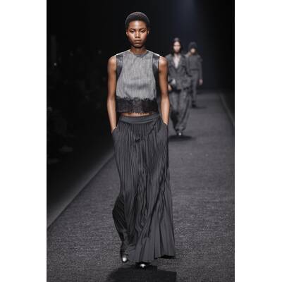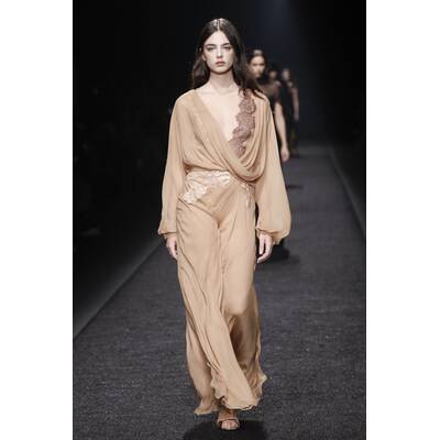 Die femininen Chiffonkleider von Alberta Ferretti sind zu ihrem Markenzeichen geworden, aber die Designerin spielte auch mit dem Kontrast zwischen männlichen und weiblichen Elementen. Den Laufsteg dominierten schöner Tweed-Hosenanzüge und raffiniert geschnittener Mäntel.