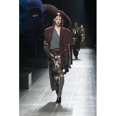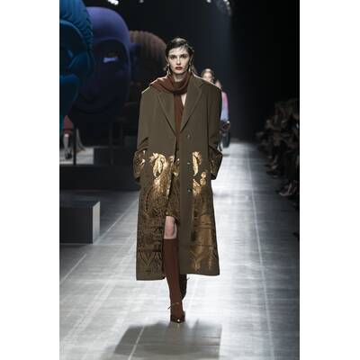 Marco De Vincenzo wählte für die Kollektion die Probedrucke antiker Stoffe, die in der Kollektion vielseitig zum Einsatz kommen. Fließende Silhouetten finden sich in Layering-Looks wieder. Dies wiederum wird mit kompakten Mänteln und Jacken kontrastiert, die der fließenden Dynamik eine selbstbewusste Stärke entgegensetzen.
