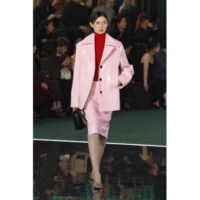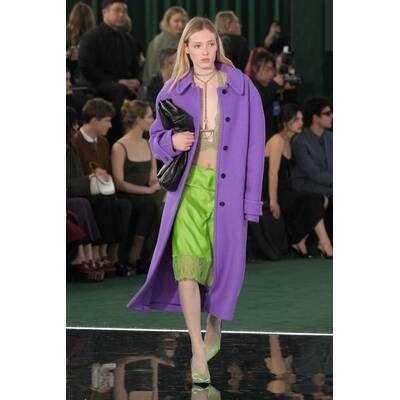 Der Catwalk, geformt aus einem überdimensionalen Gucci-Logo, bot die perfekte Bühne für die neuen Kreationen. Midiröcke mit Stickereien, raffinierte Spitze, edles Leder und ein gekonnter Einsatz von Colour-Blocking – darunter leuchtendes Lila und frisches Limoncello-Gelb. Und dann wären da noch die Stumpfhosen: mal samtig schimmernd mit Logo-Print, mal als gewagter Catsuit. Kurz gesagt: Gucci zeigt, dass Retro und Moderne wunderbar harmonieren können.