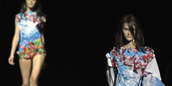 Die Schau des Antwerpener Labels Maison Martin Margiela inszenierte ein Spiel mit Material und Silhouette: Lederstiefel endeten in einer Papiertüte, mädchenhafte Kleidchen waren mit Fahrrad-Reflektoren bestickt. Ein mit einem Postkartenmotiv bedrucktes Kleid entpuppte sich hinten als Strickhöschen, überlange Lederstiefel verschmolzen vorne mit einer Hose, hinten mit einem Schleppenrock. Überhaupt beschäftigten Margiela die Schleppen und das Schleppen. Die Models zogen unter den Röcken verborgene lange Ketten hinter sich her oder - als Finale - eine überlange schmale Stoffbahn, die vollkommen den Laufsteg bedeckte.