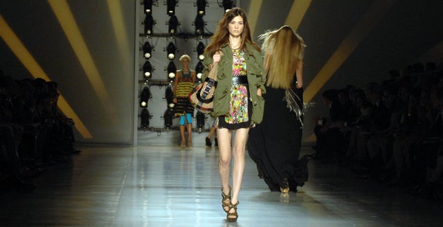 Das Italo-Label Etro setzt auf Stilbruch undentschärft ultrakurze Miniröcke mit lässigen Blousons und wuchtigenPlateau-Heels. Hingucker: Die Jacke wird in den Rock gesteckt und mitLedergürtel auf Figur getrimmt.
