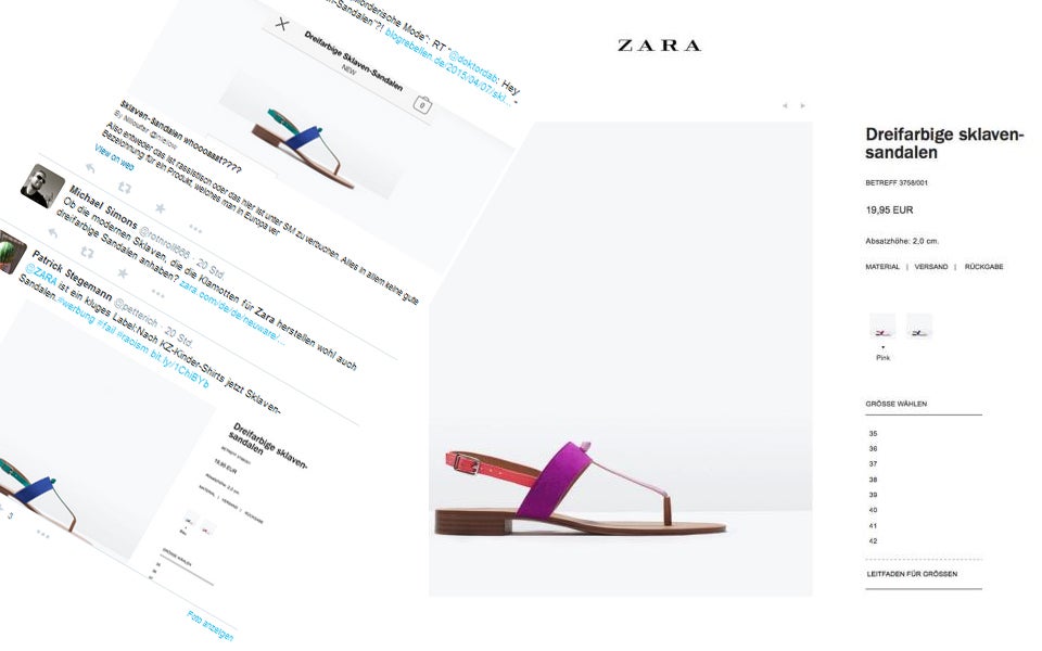 Die spanische Modekette Zara steht erneut unter Beschuss. Wieder hat das Label mit einem Fehltritt im Onlineshop einen regelrechten Shitstorm auf Twitter ausgelöst: Bis Dienstagsabend wurden Sandalen mit der Bezeichnung „Dreifarbige Sklavensandalen“ verkauft. Nachdem sich Kunden online beschwerten und eine Lawine an Negativkommentaren in sozialen Netzwerken auslöste, reagierte das Unternehmen und nahm den Artikel offline.