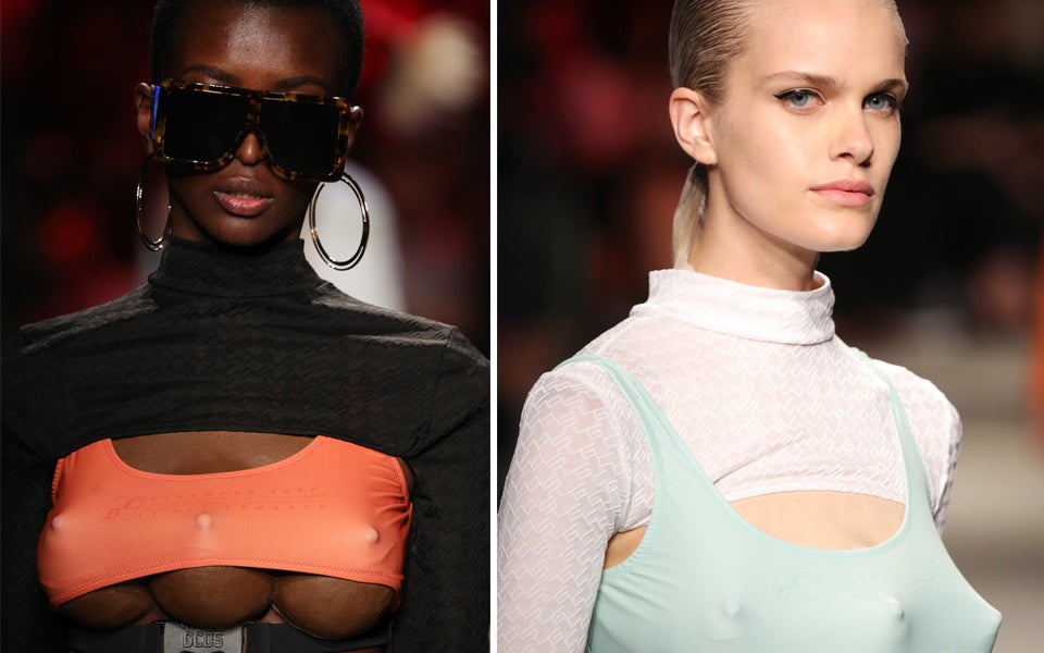 Die Streetwear-Marke GCDS hat zwei Models mit drei aufgeklebten Brüsten auf den Laufsteg geschickt. Das Plastikdekolleté lugte hinter dem knappen Top hervor. Der Betrachter fühlt sich unweigerlich an den Science-Fiction-Film "Total Recall" erinnert, in dem Arnold Schwarzenegger auf dem Mars einer Frau mit drei Brüsten begegnet.