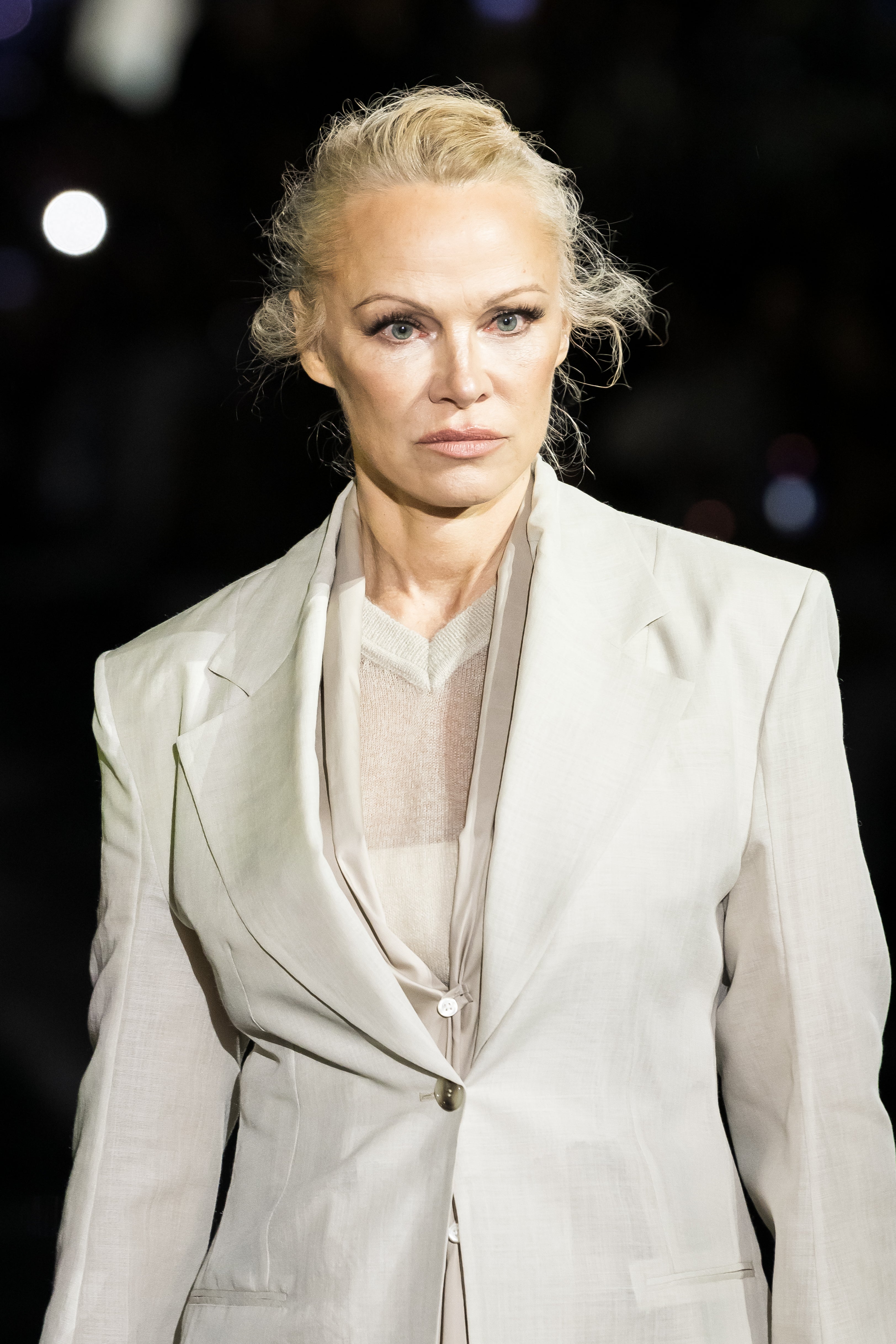 Die 90er-Ikone trug nur leichtes Augen-Makeup, nudefarbene Lippen und nach hinten frisiertes Haar - ein ungewohnter Look für die Bombshell-Blondine. Statt körperbetontem Look defilierte sie in einem leichten Blazer in Beige und einer Anzughose im Business-Chic. Pamela war nicht die einzige Promi-Dame am Runway. Supermodel Naomi Campbell, Sängerin Demi Lovato und Victoria's Secret Engel Candice Swanepoel liefen auch über für das deutsche Label. Als First Face - jenes Model, das als erste den Laufsteg betritt - wurde Pamela jedoch eine besonders wichtige Rolle eingeräumt.