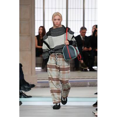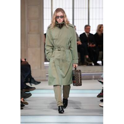 Die Models auf dem Laufsteg verwandelten sich zu stilvollen Reisenden, Detektiven in eleganten Trenchcoats oder Partygirls, die noch schnell ihren letzten Zug erwischen wollten. Ergänzt wurde die Kollektion durch sportliche Akzente wie Kapuzenjacken mit Reißverschlusstaschen und weite Silhouetten, die an die Dynamik und Romantik des Reisens erinnerten. Besonders beeindruckend: lange, geschwungene Mäntel aus fließender Wolle, maßgeschneiderte Anzüge mit soften Lederdetails und Seidenschals, die den Look abrundeten.