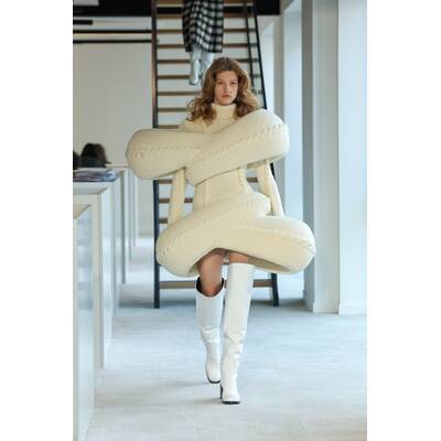 Das Finale der Freizügigkeit lieferte Duran Lantink. Der niederländische Designer stellte die Modewelt buchstäblich auf den Kopf: Ein weibliches Model trug einen männlichen Oberkörper als Oberteil, ein männliches Model trug Fake-Brüste. Doch das war erst der Anfang. Beim Umdrehen blitzten die nackten Pos der Models aus den tief sitzenden Jeans hervor. Ob man seine Kreationen im Alltag tragen kann? Eher fraglich. Aber sicher ist: Bei Duran Lantink wird Nacktheit zur Kunst.