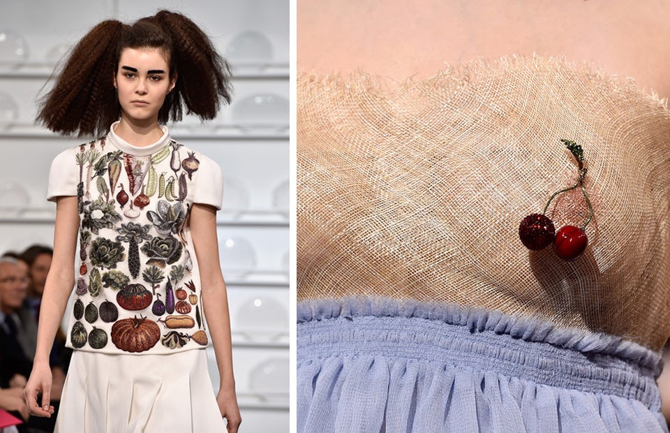 Mode als reich gedeckter Tisch: Mit Motiven aus der Küche hat Bertrand Guyon, Chefdesigner des Modehauses Elsa Schiaparelli, in Paris seine Haute-Couture-Kollektion für Frühjahr/Sommer 2016 präsentiert. Die Gäste saßen am Montag neben hohen weißen Regalen, gefüllt mit rustikal angehauchtem Tischgeschirr. Die vorgeführten Kleider trugen Teller, Früchte und Tassen als Muster.