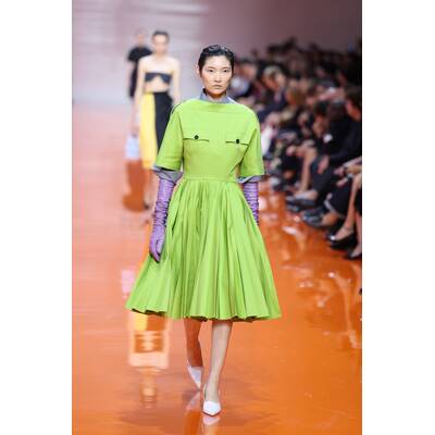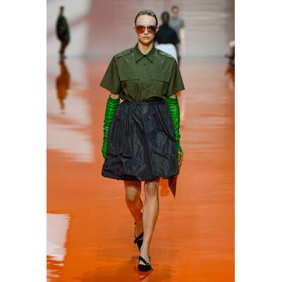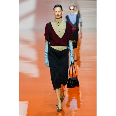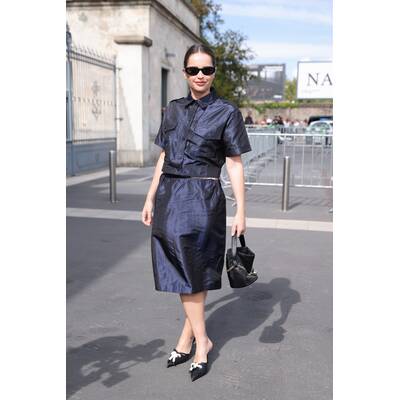Bei Prada versammelte sich eine hochkarätige Gästeliste: Rita Ora, DJ Peggy Gou und Schauspielerin Carey Mulligan nahmen in der ersten Reihe Platz und setzten selbst mit ihren Outfits ein modisches Statement. Als hätten sie sich abgesprochen erschienen alle Ton-in-Ton in blauen Denim-Looks. Die Kollektion selbst zeigte Layering in mutigen Farben, die den Spagat zwischen futuristisch und tragbar meisterten.