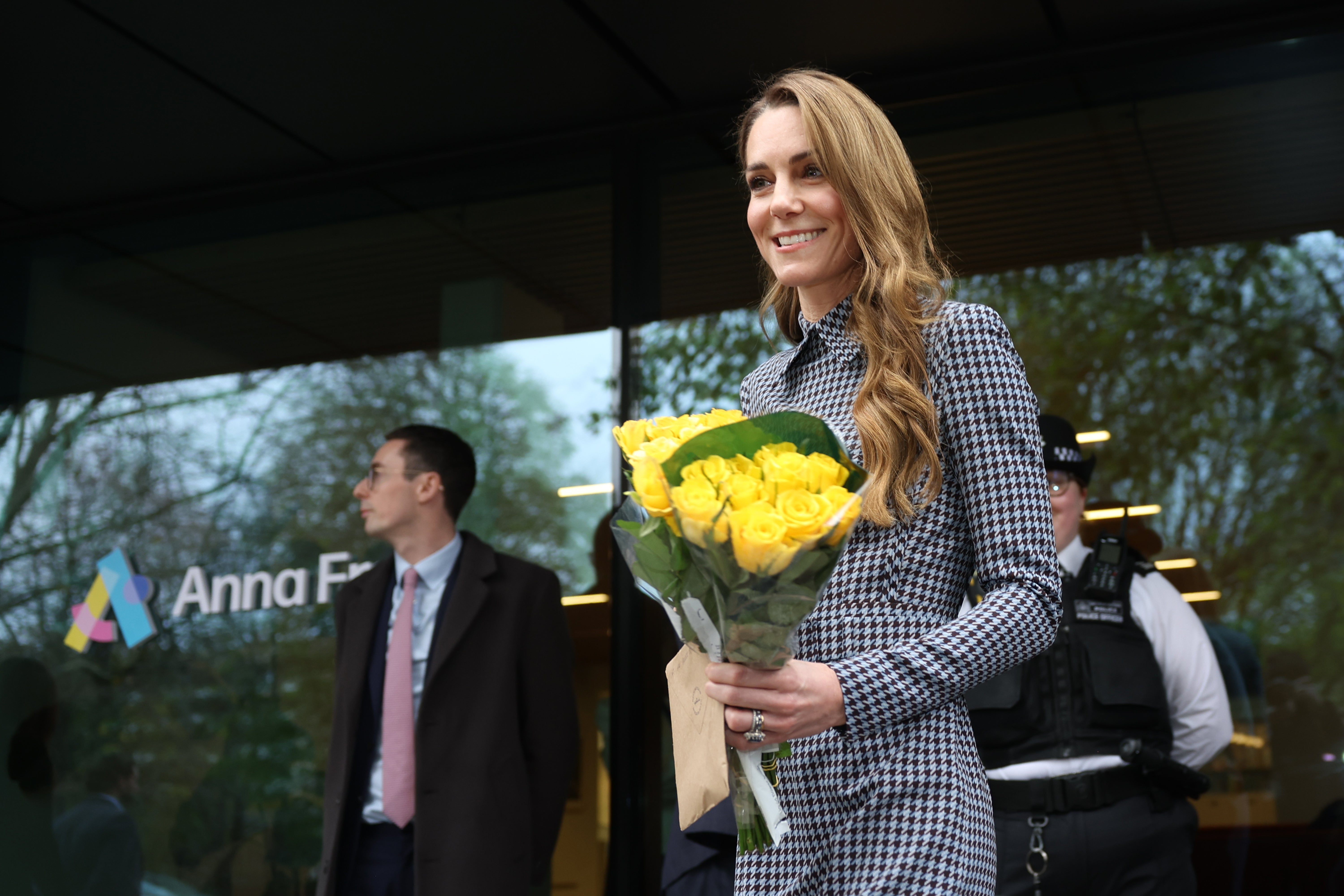 Bei ihrem jüngsten Auftritt zeigte sich Kate in einem eleganten hellblauen Midikleid von Emilia Wickstead, einem Modell, das wir schon 2022 bei einem Besuch der Harvard University gesehen haben. Das Kleid besticht durch seinen femininen Schnitt, den Hemdkragen und das feine Hahnentritt-Muster, das für einen klassischen, zeitlosen Look sorgt.
