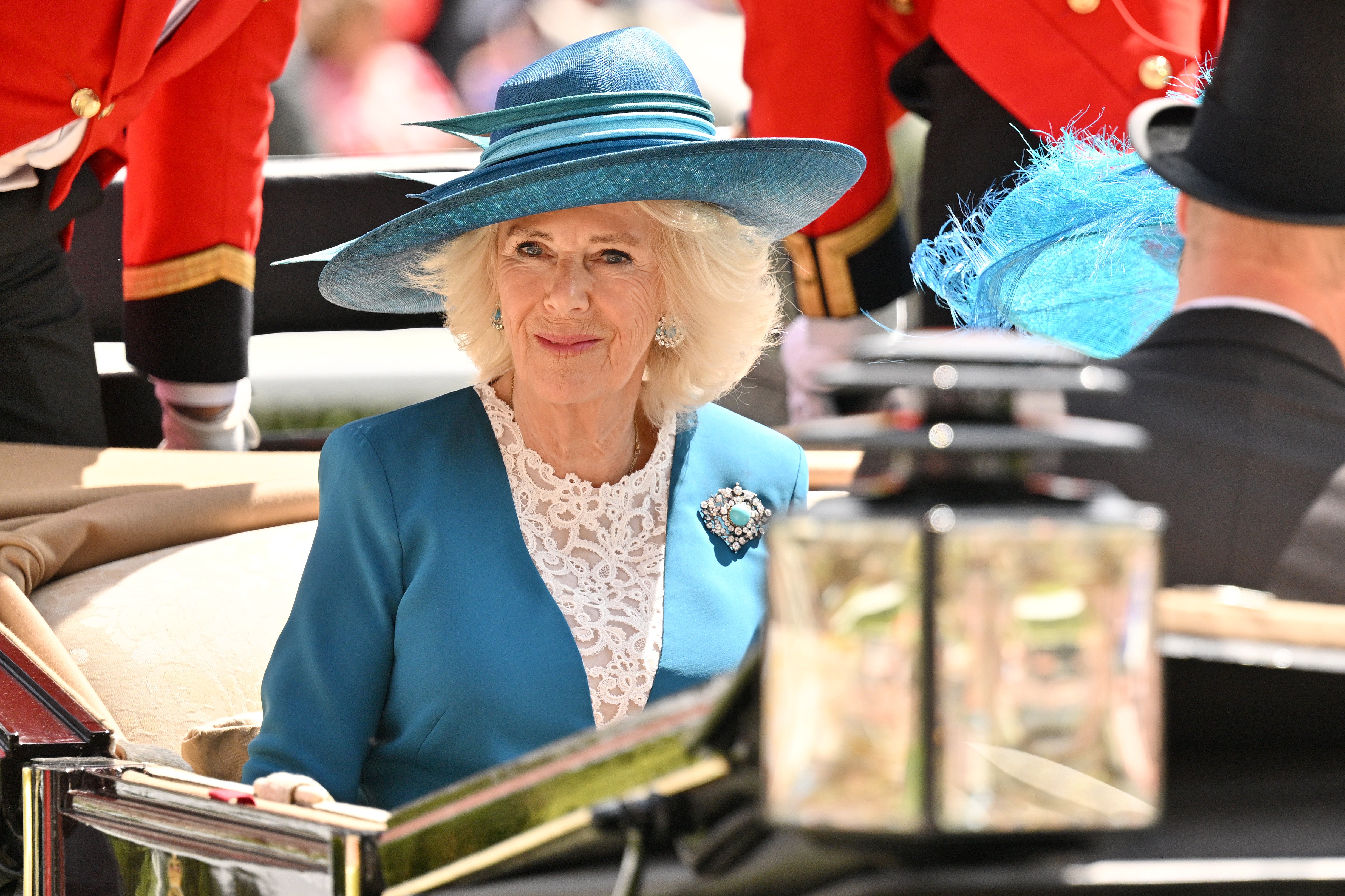 Bei der Eröffnung strahlt Königin Camilla in einem blauen Ensemble, das eine ihrer Lieblingsdesignerinnen Fiona Clare gefertigt hat. Dazu kombiniert die Britin einen farblich passenden Hut.