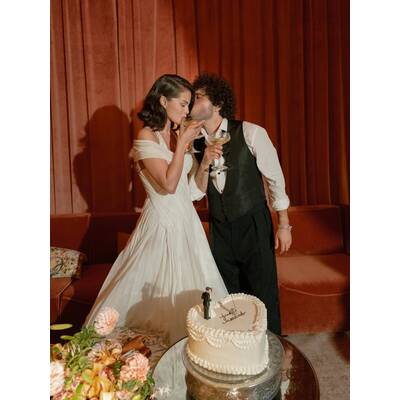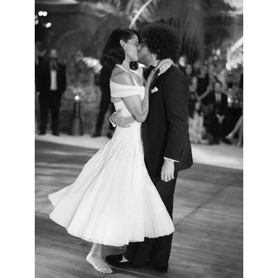 Nach der Trauung hieß es, noch nicht ab auf die Tanzfläche, sondern ab ins große Abendprogramm. Für den Dinner-Auftritt schlüpfte Selena in ein figurbetontes Kleid, mit klaren Linien, subtiler Stickerei und den Initialen S & B. Ein Kleid, das Glamour pur versprühte. Der Look war perfekt für den feierlichen Teil des Abends – sophisticated, modern und wie gemacht für Kerzenschein, Fotos und natürlich jede Menge „Wow“-Momente.