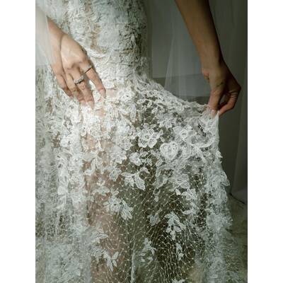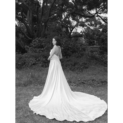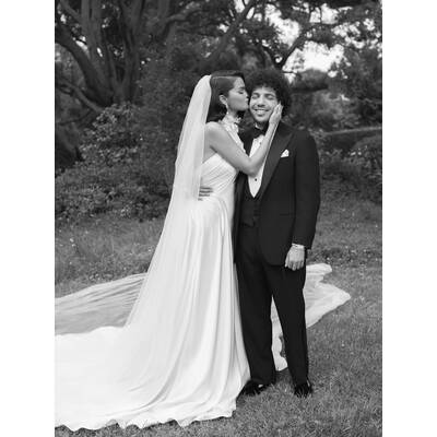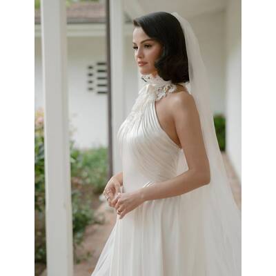 Für die Trauung selbst setzte Selena auf ein elegantes, schulterfreies Kleid mit Neckholder-Oberteil. Das Material? Feinster, schwer fallender Satin, der perfekt in Szene setzte, was eine Braut an diesem Tag ausstrahlen soll: Eleganz und zeitlose Schönheit. Der ausgestellte Rock fiel in sanften Falten und verlieh dem Look einen Hauch royalen Glamours – ganz ohne Schnickschnack, dafür mit Fokus auf Linien und Proportionen. Dazu trug sie einen Strauß aus Maiglöckchen – ein Symbol für Liebe, Reinheit und Erneuerung, mit dem schon Kate Middleton und Grace Kelly Ja sagten.