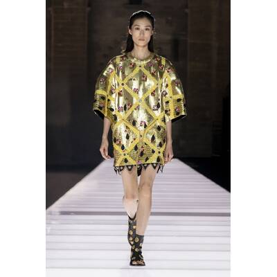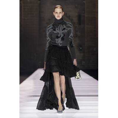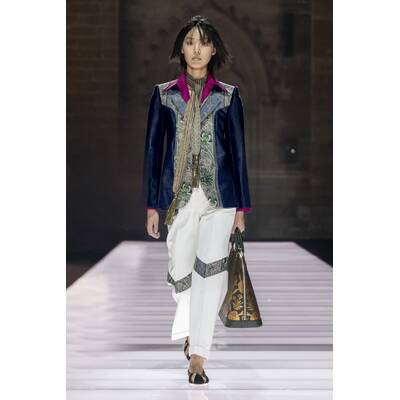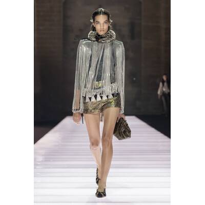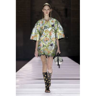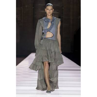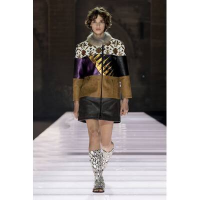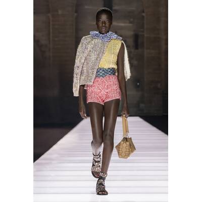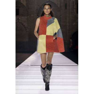 Der Runway selbst war ein Potpourri aus Cape-Vibes, asymmetrischen Schnitten und einem kräftigen Schuss Vokuhila-Romantik. Besonders im Trend: Butter Yellow – eine Farbe, die irgendwie schmeckt, aber auch extrem gut aussieht. Wer Muster liebt, kam ebenfalls auf seine Kosten: von psychedelisch bis Patchwork war alles vertreten, als hätte das Stofflager ein Eigenleben entwickelt.