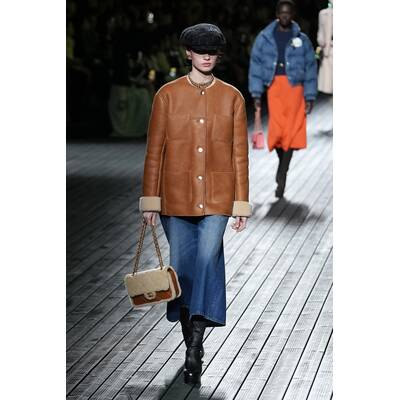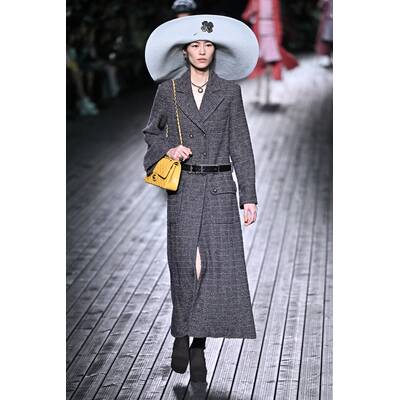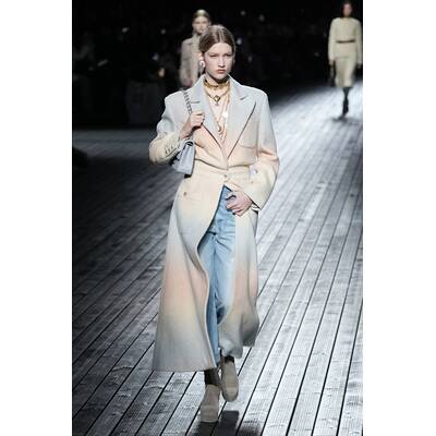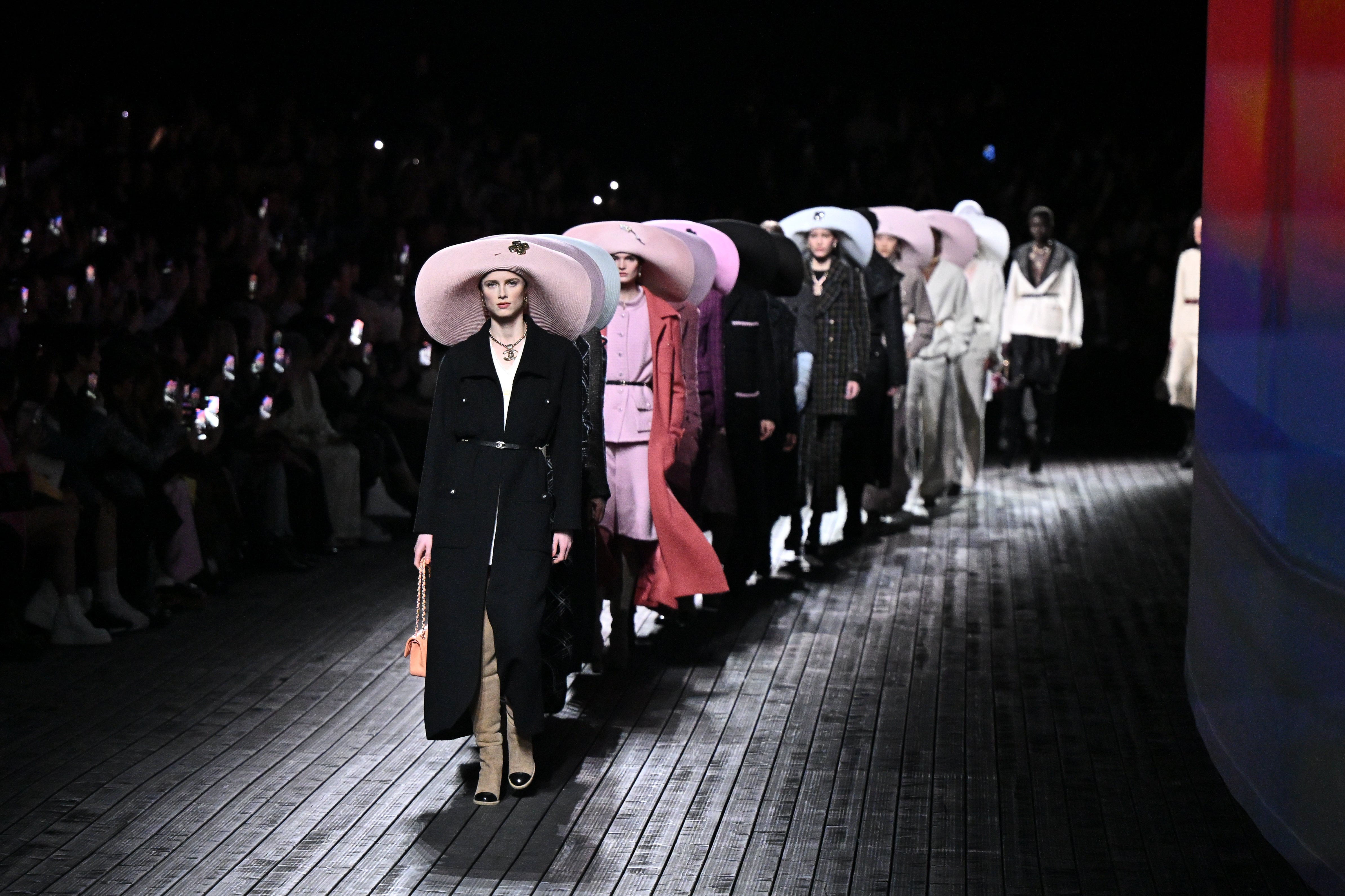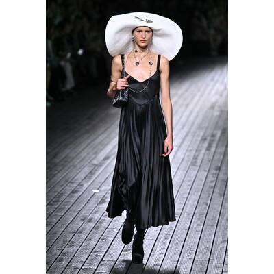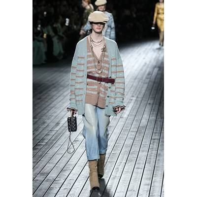 Darauffolgend schickte Chanel-Designerin Virginie Viard Models mit XXL-Strohhüten und Tweed-Ensembles in Pastellfarben über den Laufsteg. Bedruckte Pyjamas wurden mit langen Tweed-Mänteln und klassischen Taschen des Hauses in knalligen Farben kombiniert. Gestreifte Strickjacken wurden zu lässigen Jeans getragen. Schmuck und Accessoires erinnerten an die 80er-Jahre.