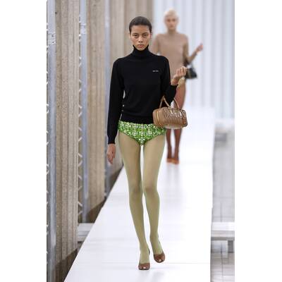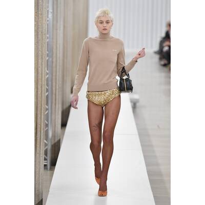 In der Herbst/Winter 2023 Kollektion des Labels dominiert der Slip. Die Höschen der Saison sind mit glitzernden Pailletten versehen oder, wie das Modell von Emma Corrin, aus raffiniertem Strick in Herbsttönen.