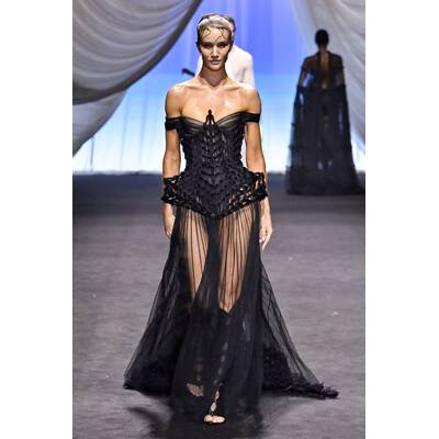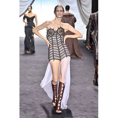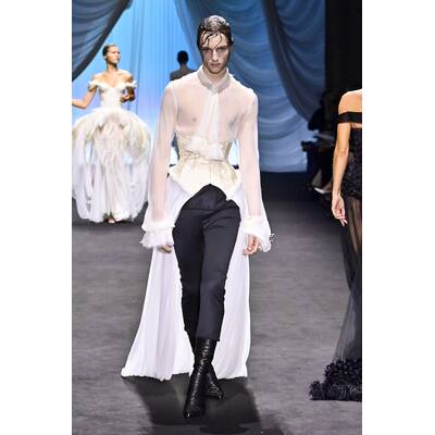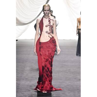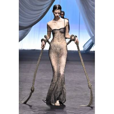 Parallel dazu lieferte Ludovic de Saint Sernin eine mehr als gelungene Hommage an Jean Paul Gaultier. Seine Show stand unter dem Motto "Le Naufrage" – der Schiffbruch. Aber keine Sorge, das war kein Titanic-Desaster, sondern eine sinnliche Interpretation der Gaultier-DNA. Corsagen, fließende Stoffe und ein Hauch von Verwegenheit – Saint Sernin bewies, dass er das Erbe Gaultiers versteht und es mit einer modernen Sensibilität ins Hier und Jetzt transportieren kann. Ein besonderes Highlight war die kunstvolle Verarbeitung von Stoffen, die an nasse, eng an den Körper geschmiegte Kleider erinnerten – als wären die Models gerade einem luxuriösen Unterwasser-Abenteuer entstiegen. Diese raffinierte Umsetzung zeigte nicht nur Saint Sernins Gespür für Dramatik, sondern auch seine Fähigkeit, ikonische Gaultier-Elemente neu zu interpretieren.