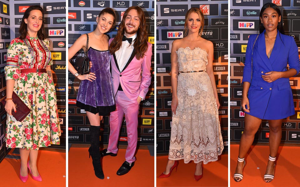 Doch bevor die Show startet, posiert alles was Rang und Namen hat vor der Fotowall. Dieses Jahr defiliert die Prominenz über einen orangen Teppich, wo Street Styles statt klassischer Cocktailmode in Szene gesetzt wird. Von eleganten Pyjamalooks (sehr schick: Blogger Madeleine Alizadeh alias Daria Daria) bis zu Laufsteg-Mode made in Austria (entzückend: Franziska Knuppe in Lena Hoschek). Moderiert wird die Show von Viviane Geppert, die sich für einen bezaubernden Spitzen-Look in Nude entschieden hat.