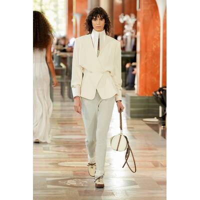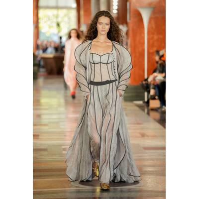 Nicolas Ghesquière begeisterte bei der Paris Fashion Week mit seiner atemberaubenden Frühjahr/Sommer-Kollektion 2026 für Louis Vuitton. Der Laufsteg war eine wahre Ode an Eleganz und Leichtigkeit: Transparente Stoffe und helle Farben dominierten das Bild. Weiß und Beige zogen sich wie ein roter Faden durch die Kollektion und die Models schwebten in fließenden Kleidern und leichten Stoffen über den Laufsteg. Besonders die dramatischen Kragen stachen heraus und gaben den Looks eine extra Portion Drama.