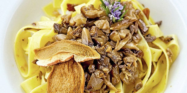 Zutaten für 6 Portionen 600 g Fettuccine all’uovo, 500 g frische Steinpilze, 1 Schalotte, 1 Knoblauchzehe, 125 ml Sahne, 5 EL Olivenöl, 3 EL geriebener Parmesan, 2 Stämmchen kleinblütige Bergminze (Nipitella, ersatzweise Majoran), Salz, Pfeffer