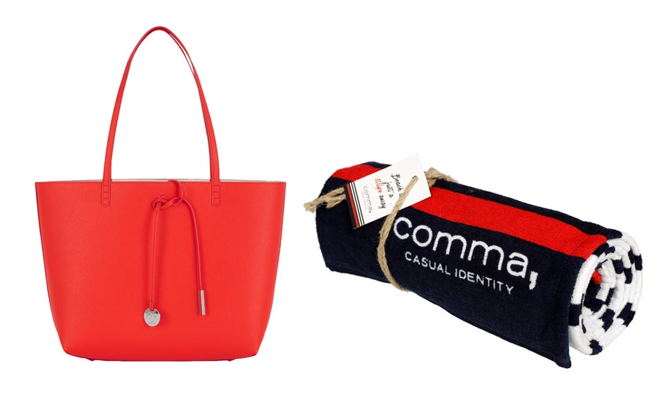 Wer am Strand Eindruck machen möchte, spielt am besten gleich mit und kann mit etwas Glück diesen roten Shopper (Wert: 59,99 Euro) und das gestreifte Strandtuch von Comma Casual Identity (Wert:19,99 Euro) gewinnen.