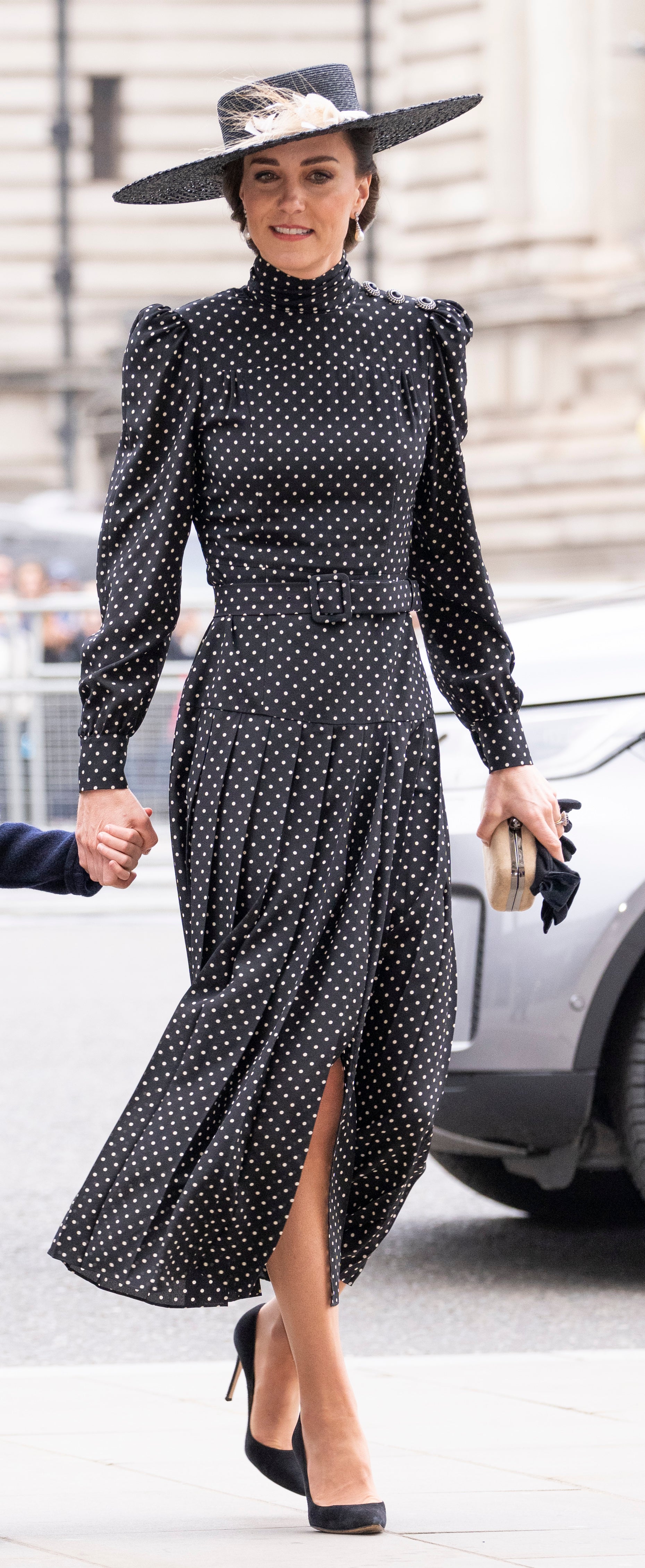 Mit XXL-Hut und verspielten Pünktchen erschien Herzogin Kate beim Trauergottesdienst für Prinz Philip.