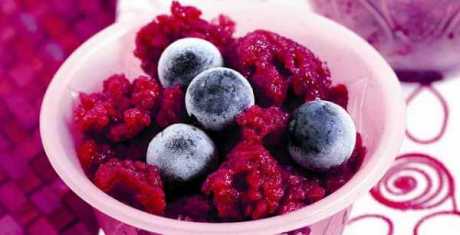Den Saft am nächsten Tag abgießen, die Beeren mit der Küchenmaschine mixen bis sie platzen. Nun die Masse durch ein feines Sieb streichen. Zitronensaft zugeben, die Beerenmasse 2 Stunden einfrieren. Mit einer Gabel die gefrorenen Stellen vom Rand zur Mitte ziehen. Erneut einfrieren. Nach weiteren 3 Stunden ist die Granita fertig. Einfach nach nochmaligem Auflockern servieren. Mit den restlichen Beeren dekorieren.