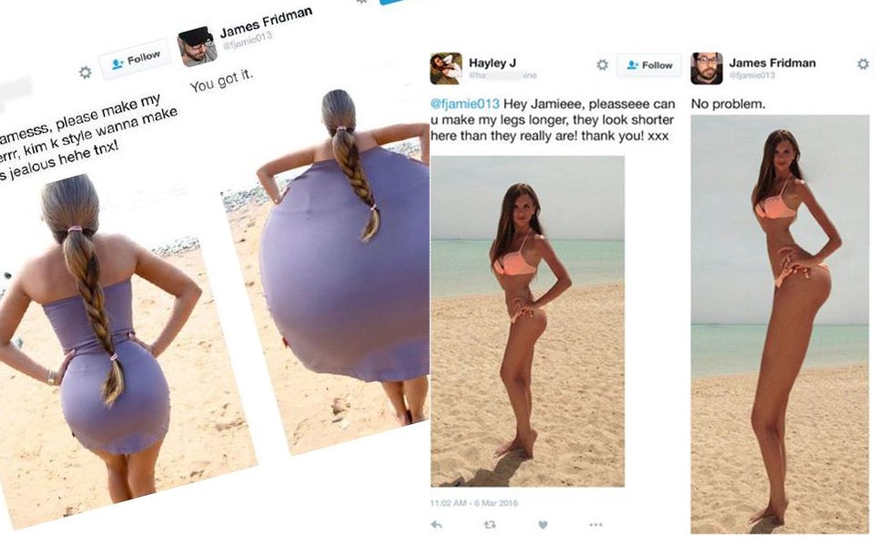 James Fridman erfüllt die Wünsche seiner Kunden - und zwar wortwörtlich. Das Ergebnis haben sie sich allerdings wohl anders vorgestellt. Auf Twitter postet der Designer die Retusche-Anfragen und das dazugehörige Foto. Die absurde Umsetzung der Wünsche ist nicht nur ein witziger Gag, sondern führt uns auch vor Augen, wie unrealistisch die Ansprüche an unsere Körper sind.