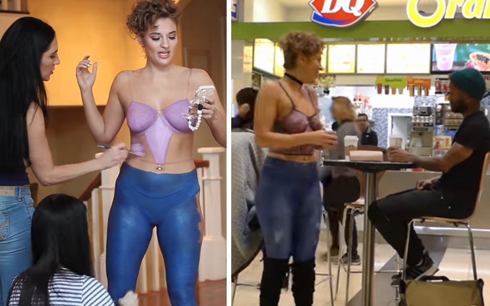 Vor dem Date wurde das Model von zwei Make-Up-Artisten mit Bodypainting bepinselt. Mit einem täuschend echtem Outfit aus aufgemaltem Top und Jeans traf sie einen jungen Mann zum Kaffee. Dieser merkt zunächst nicht, dass sein Gegenüber nur Schuhwerk trägt. "Du siehst elegant aus", lässt er sein Date wissen. Erst als eine Gruppe Teenager Selfies mit dem Model knipsen möchte wird ihm bewusst, dass er seiner Begleitung auf den Leim gegangen ist.