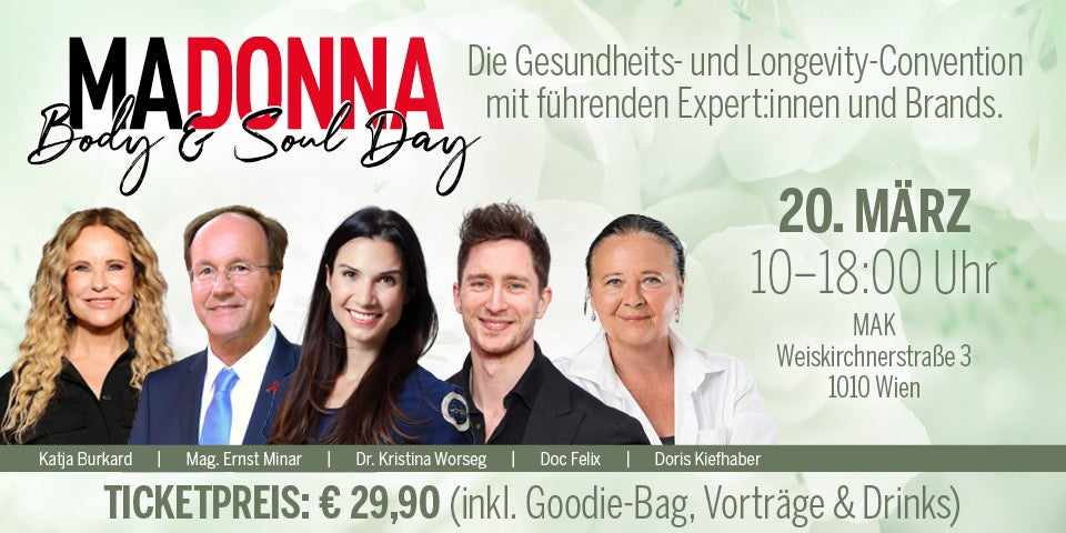 Nach dem großen Erfolg im Vorjahr geht der MADONNA Body & Soul Day in die nächste Runde. Gemeinsam mit führenden Expert:innen aus Gesundheit, Longevity und moderner Medizin lädt MADONNA zu einem inspirierenden Tag ganz im Zeichen von Wohlbefinden, Wissen und Self-Care.