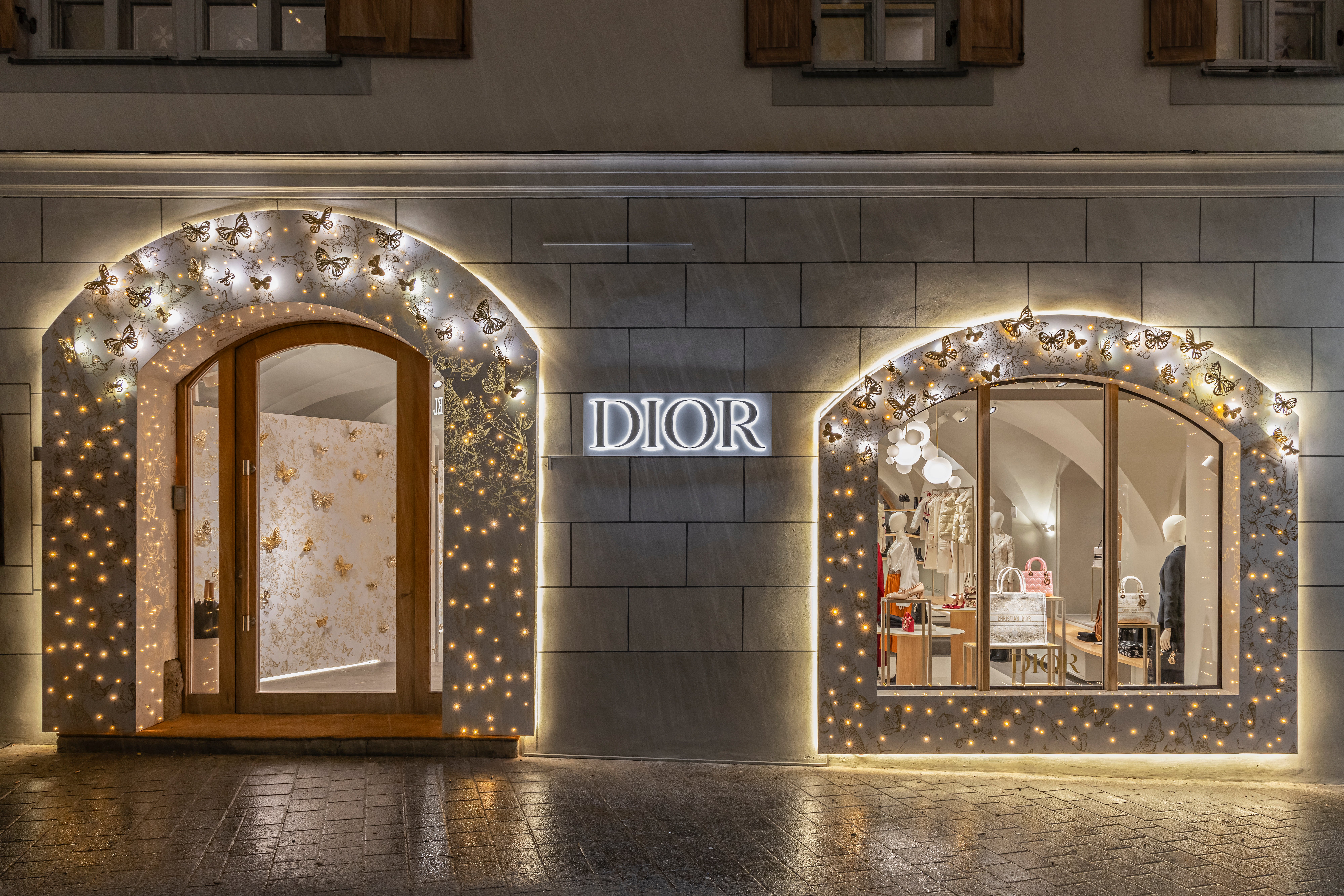 In einem bezaubernden Rahmen, der an Berghütten, Schnee und Luxus erinnert, wird die Natürlichkeit von Holz und die Reinheit von Weiß, wie eine Ode an die Schönheit der Berge, vereint. Inspiriert von der Dior Cruise-Kollektion 2024 ist das Interieur des Pop-up-Stores mit goldenen Schmetterlingen verziert, die ihre Flügel ausbreiten und symbolisch durch die Boutique wirbeln.