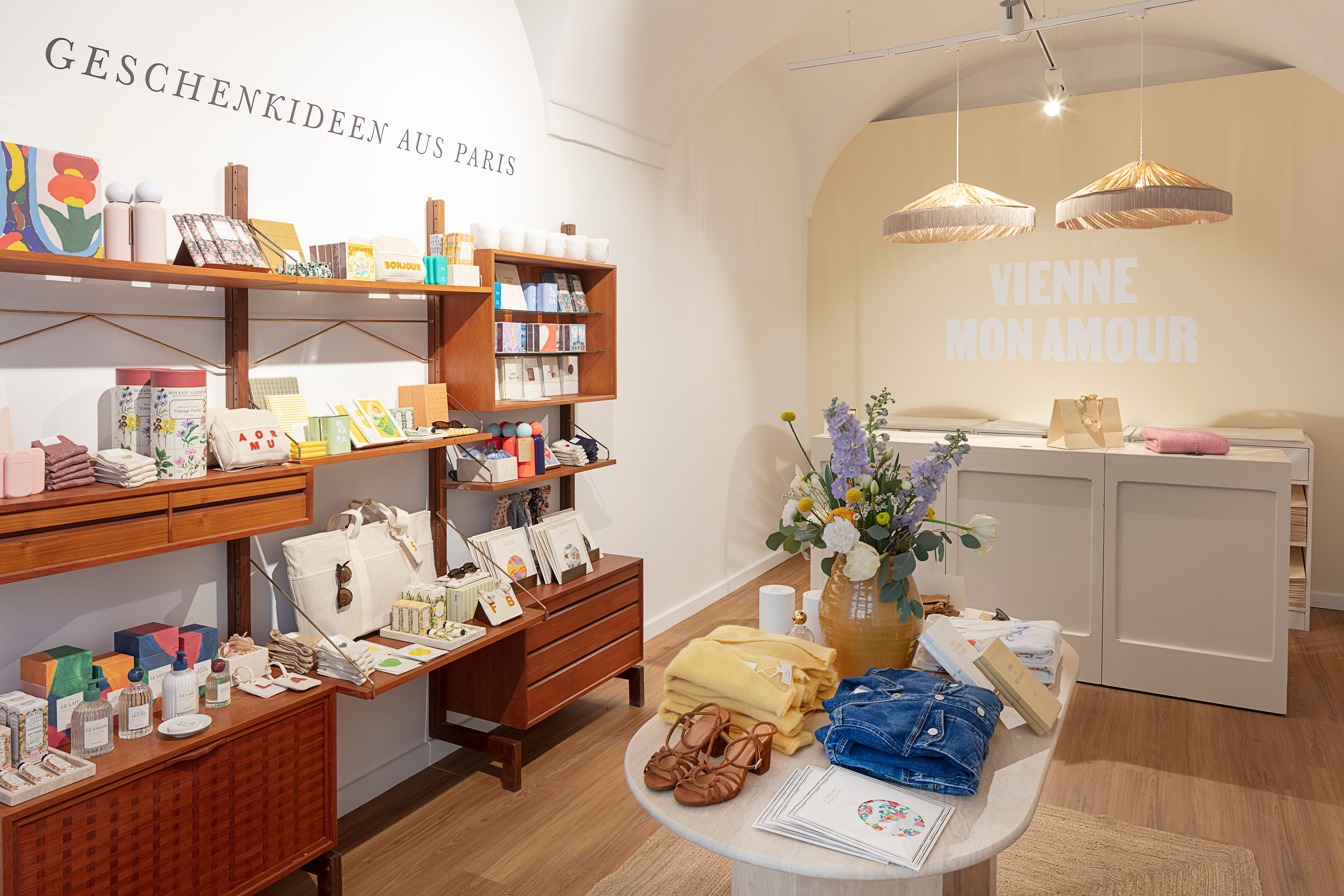 Am Bauernmarkt 1 taucht man ab sofort in ein Pariser Universum ein. Cardigans in leuchtenden Frühlingsfarben, Perlen-verzierte Schmuckstücke und schicke Lederwaren in Häkeloptik zieren die Wände des Stores, welcher an ein edles Pariser Apartment erinnert.