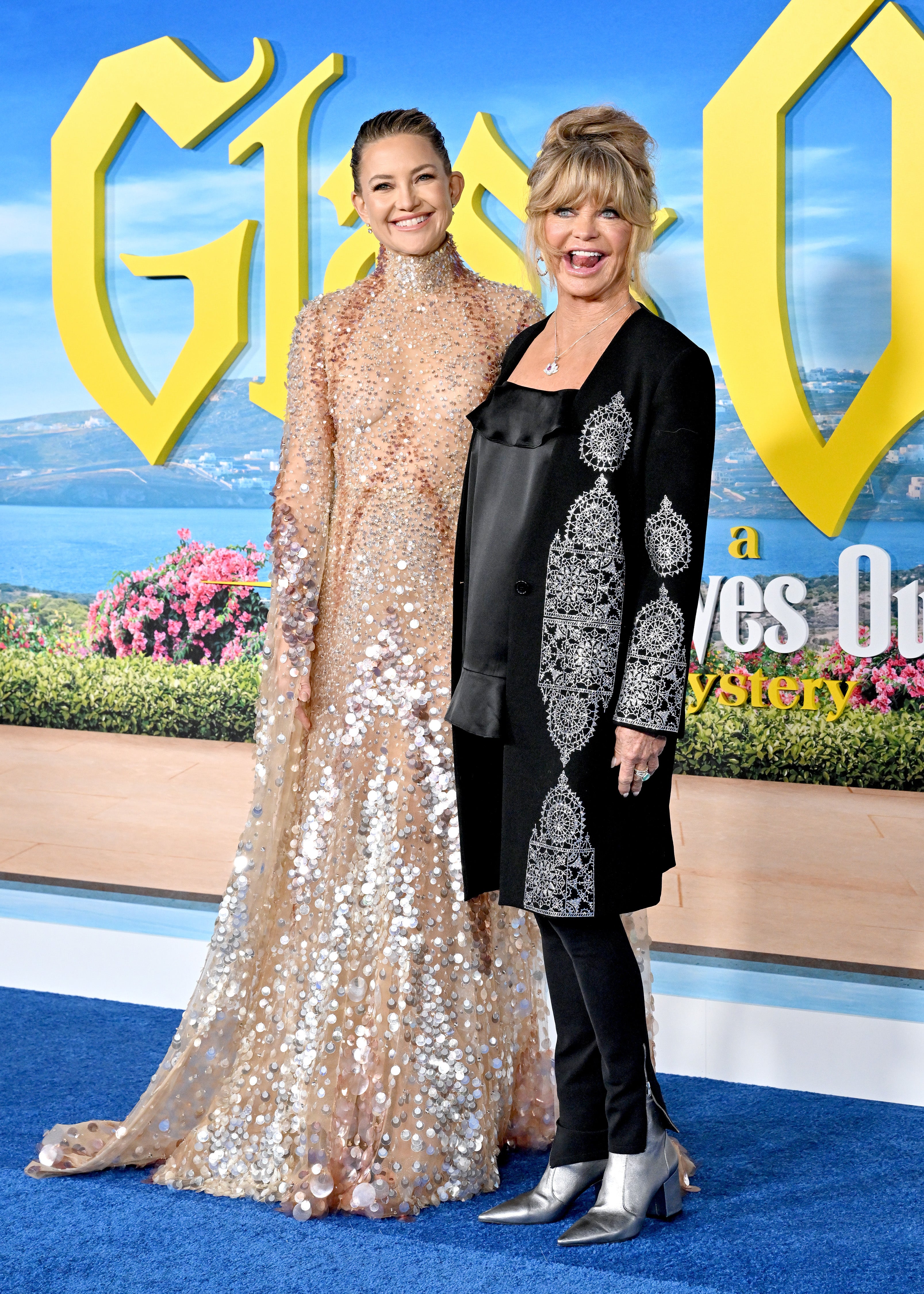Bei der Premiere von Glass Onion: A Knives Out Mystery in Los Angeles zogen Goldie Hawn und Tochter Kate Hudson alle Blicke auf sich. Letztere erschien in einem bodenlangen durchsichtigen Kleid mit verspielten Details. Ihre 76-jährige Mutter wählte einen schwarzen Hosenanzug mit weißen Stickereien.