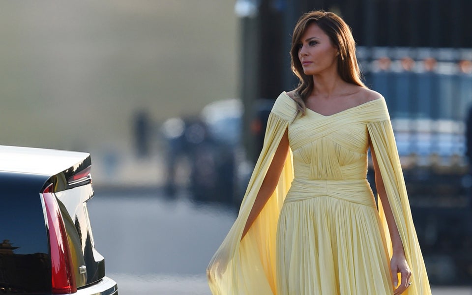 Donald Trump und seine Gattin Melania befinden sich seit Donnerstag auf Besuch in Großbritannien. An ihrem ersten Abend lud sie Theresa May zum Galadinner ins Schloss Blenheim, wo die First Lady einen Glamour-Auftritt hinlegte. Per Hubschrauber reisten die Trumps aus London an und wurde mit großem Zeremoniell in Empfang genommen. An dem festlichen Dinner nahe Oxford nahmen auch zahlreiche Wirtschaftsvertreter teil – also packte Donald Trump seinen Smoking und Melania das ‚große Gelbe‘ aus. Die First Lady erschien in einem Pomp-Look des Designers H. Mendel – mit Cape und reichlich Chiffon-Stoffbahnen.