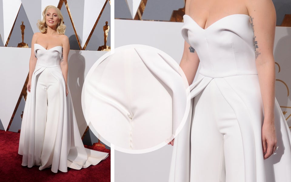 Für Lady Gagas Red Carpet-Look zeichnete sich ihr Stylist Brandon Maxwell verantwortlich. Er gestaltete den schneeweißen Oscar-Jumpsuit ganz nach ihren Vorstellungen. Weite Hosenbeine und das drapiertes Bustier sorgten im Zusammenspiel mit der langen Schleppe für ein dramatisches Red Carpet-Statement. Ein cooler Look, der perfekt hätte sein können, wenn man ein wichtiges Detail bedachte hätte...das Cameltoe-Problem!