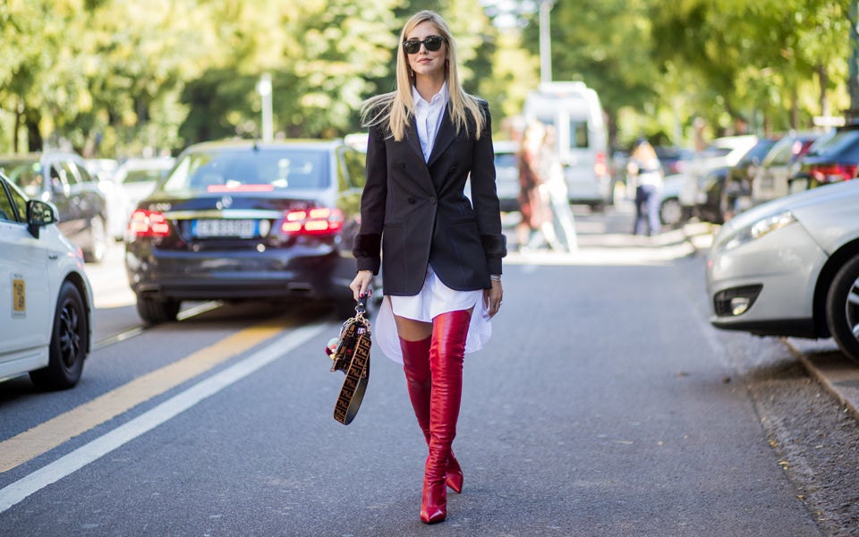 Blazer und Hemd, aber bitte mit scharf! Blogger-Superstar Chiara Ferragni beherrscht das Spiel mit den Stilkontrasten.