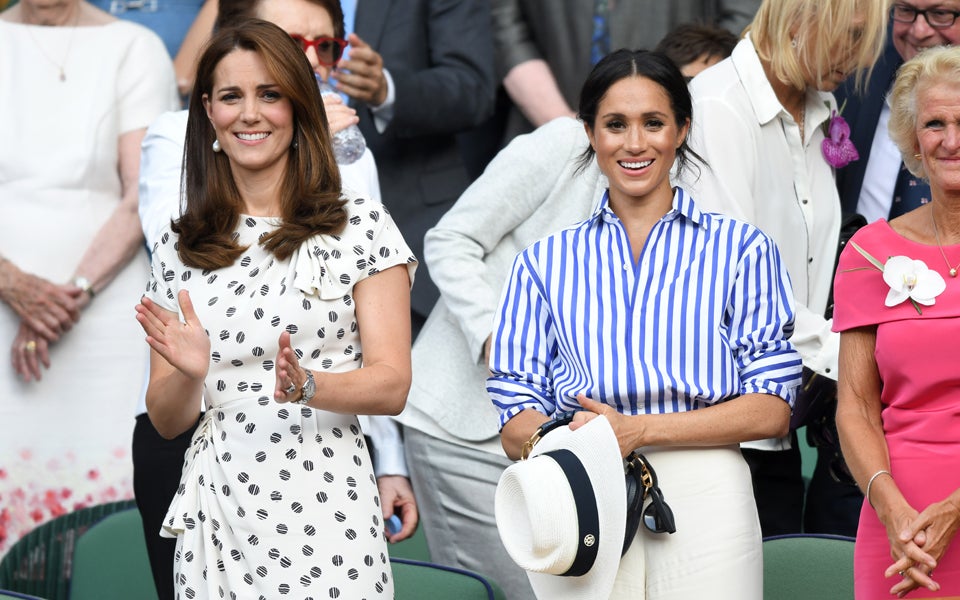 Auf diese Fotos hatten wir sehnsüchtig gewartete: Meghan und Kate als Herzoginnen-Duo in Wimbledon. Dieser erste gemeinsame Auftritt beim Finalmatch Serena William gegen Angelique Kerber war modisch ein Knaller: Meghan im schicken Streifen-Ensemble und Kate - ganz so wie wir sie kennen - im schlichten Dress von Lieblingsdesignerin Jenny Packham. Meghans Kombi aus Palazzo-Hosen und gestreiften Shirt von Ralph Lauren war eine smarte Wahl mit androgyner Note. Der Panamahut rundete den Boyfriend-Look gekonnt ab. In diesem Fall geht das Mode-Match unentschieden aus: Beide Royal Ladies sahen fantastisch aus!